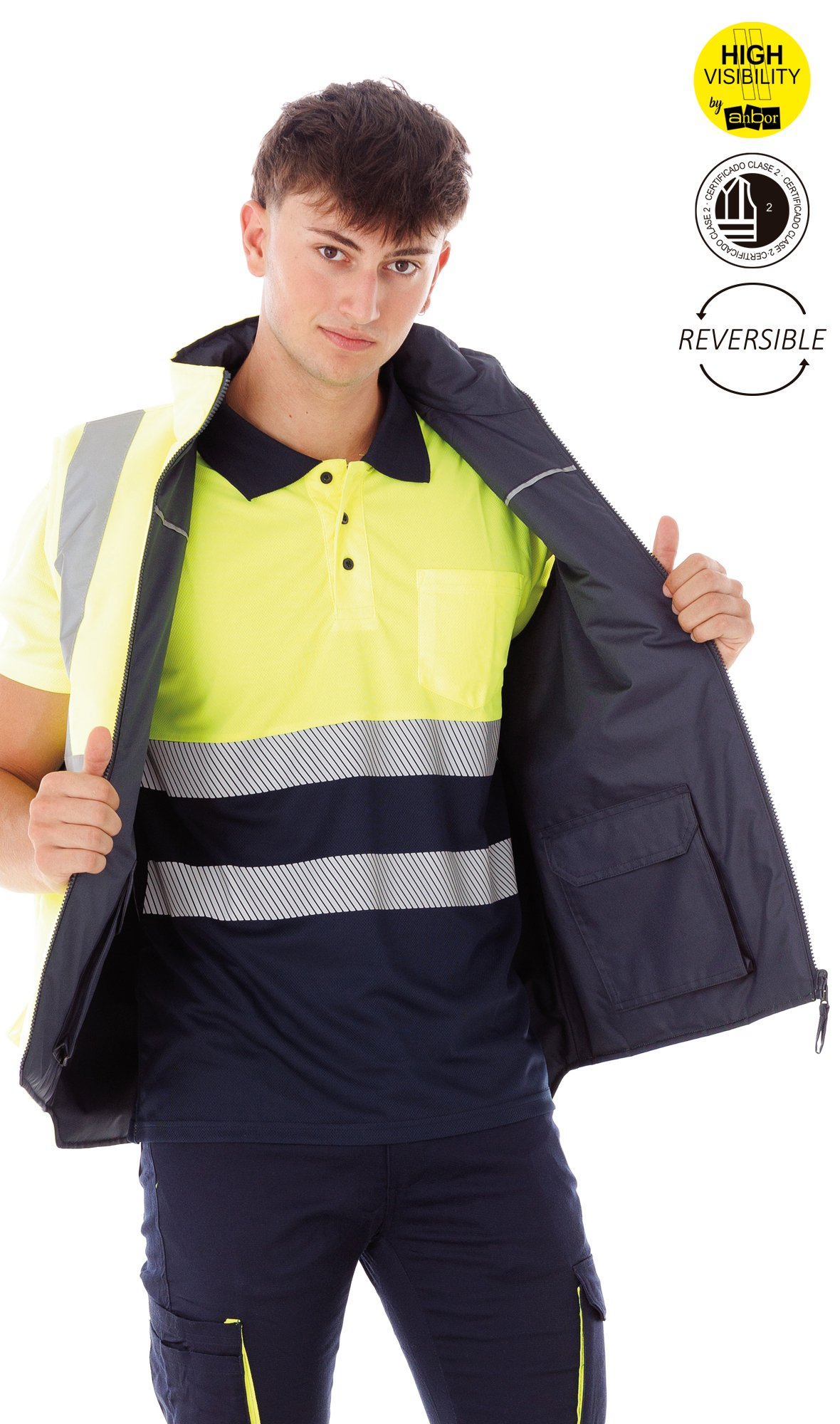 Lavado a temperatura máxima de 40ºC. No usar lejía u otros agentes blanqueantes. No lavar en seco. No usar secadora. No aplicar vapor sobre las bandas o módulos reflectantes. No planchar o aplicar vapor sobre las bandas o módulos reflectantes. No lavar la prenda junto con algodón.